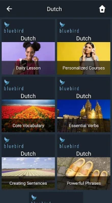 Iwe unajiandaa kwa safari, unataka kujifunza kwa burudani, shule, au kazi, Bluebird itakupa maarifa unayohitaji na kuhakikisha unayakumbuka kwa muda mrefu. Kwa maudhui yanayofaa familia nzima, kila mwanachama anaweza kufurahia safari ya kujifunza Kiholanzi kwa njia ya Bluebird. Bluebird inajivunia kuwa na kozi kamili zaidi za lugha duniani, zenye wastani wa misemo 10,000 ya kufundishia kwa kila lugha. Kila somo hudumu kati ya dakika 15 hadi 45, na wastani wa dakika 30, huku mitaala yetu ikiwa imeundwa na walimu na kutafsiriwa na wanadamu, na sauti za wazungumzaji wa asili zikirekodiwa kitaalamu.