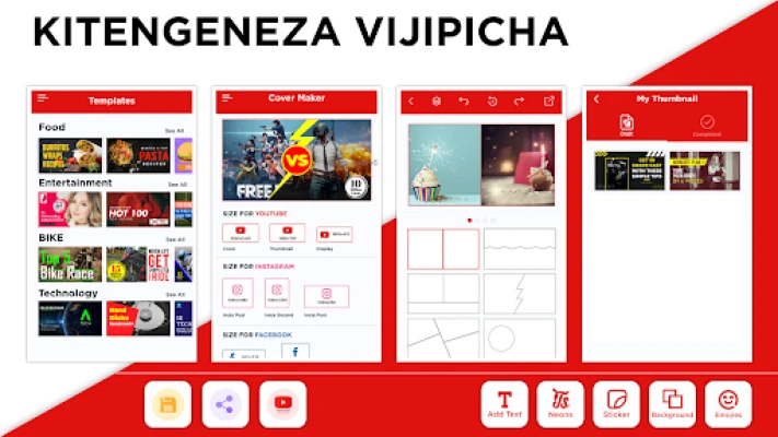 Sasa unaweza kuacha wasiwasi wa kuunda vijipicha dhaifu. "Programu yetu ya kijipicha ya ubunifu" inakuletea zana kamili ya kuunda picha za jalada zenye nguvu ambazo zitayafanya maudhui yako yasitazamike. Kiunda picha cha video si programu ya kawaida ya kuunda vijipicha vya video pekee; ni suluhisho la pande mbili ambalo pia hukuruhusu kubuni mabango ya kuvutia, picha za kufunika, na vichwa vya habari vya mitandao ya kijamii. Hii inamaanisha hautalazimika tena kutumia pesa kwenye programu nyingi tofauti au kubadilishana kati ya programu kadhaa. Utapata kila kitu unachohitaji katika sehemu moja, ukihakikisha ufanisi na urahisi.