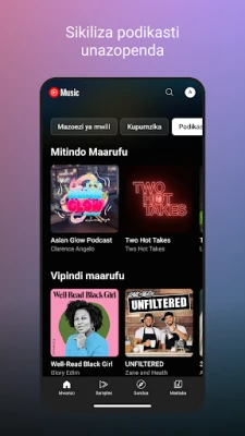 Furahia muziki ulioundwa maalum kwa ajili yako. Pokea miseto na orodha za kucheza zilizobuniwa kulingana na ladha na mapendeleo yako ya kipekee. Kuanzia miseto maalum ya kuongeza nguvu wakati wa mazoezi, nyimbo za kutuliza roho kwa vipindi vya kutafakari, hadi orodha za kucheza za kupumzika baada ya siku ndefu, kila kitu kimeandaliwa kwa ajili yako. Unaweza pia kuunda orodha zako za kucheza kwa urahisi, ukipokea mapendekezo mahiri ya nyimbo, au shirikiana na wapenzi wengine wa muziki kubuni maktaba bora ya sauti. Maktaba yako binafsi itahifadhi nyimbo, video, wasanii na albamu zote unazopenda, zikiwa tayari kukupatia raha wakati wowote.